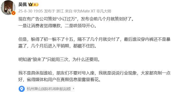 8月30日,國內著名汽車博主吳佩在社交平臺發布了一條消息,現在有廣告公司策劃“小訂過萬”,發布會前幾個月就策劃好了,一是讓消費者覺得爆款,二是為了哄領導開心,但是躲得了初一躲不過十五,進入產品平銷期后,什么都藏不住了……
