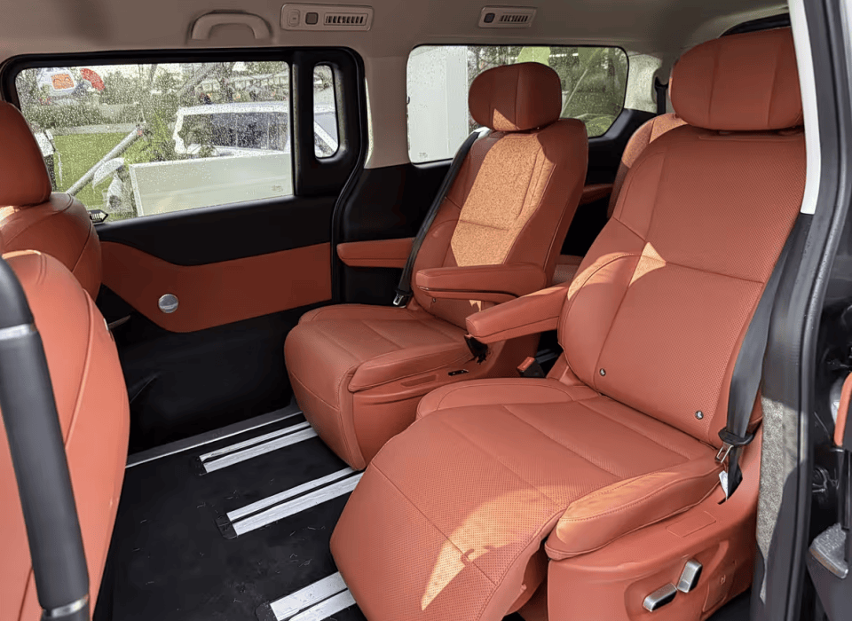 座椅布局方面,提供了7座/9座兩種座椅布局,提供后窗中窗等選裝。此次發(fā)布的7座布局車型,第二排為雙獨立式座椅,座椅具備電動調(diào)節(jié)和腿托等功能。