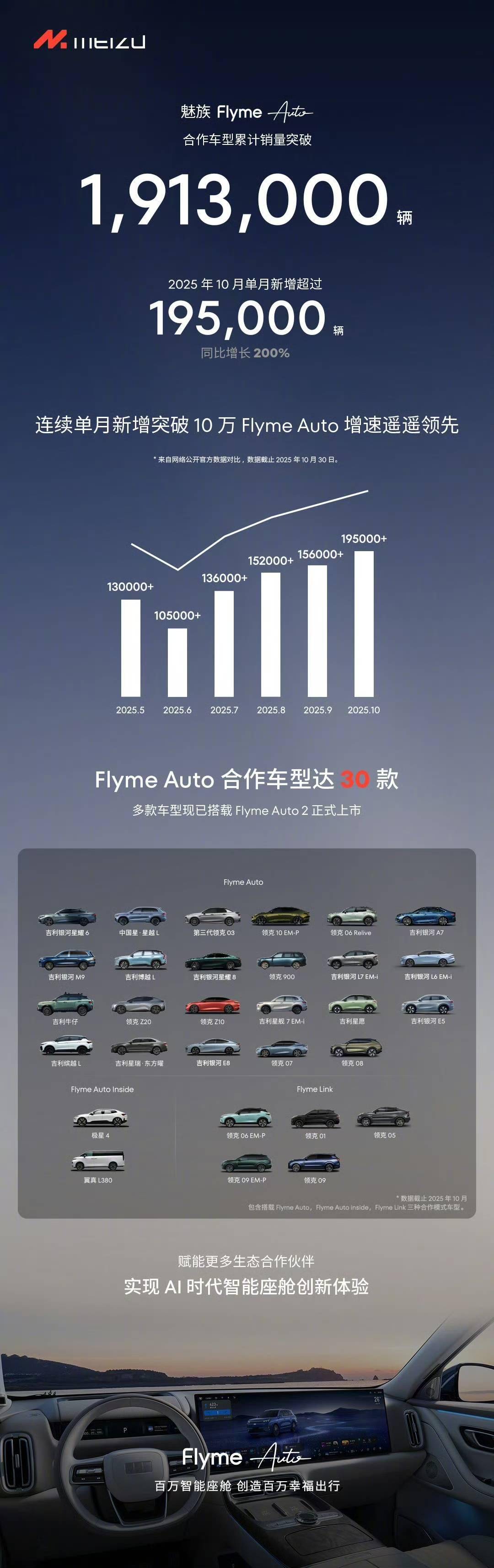 11 月 17 日消息,魅族今日宣布,Flyme Auto 合作車型 10 月單月銷量超過 19.5 萬輛,同比增長 200%,連續多月單月新增突破 10 萬。