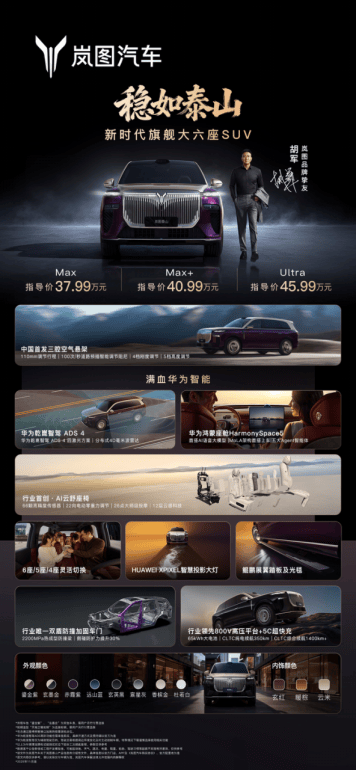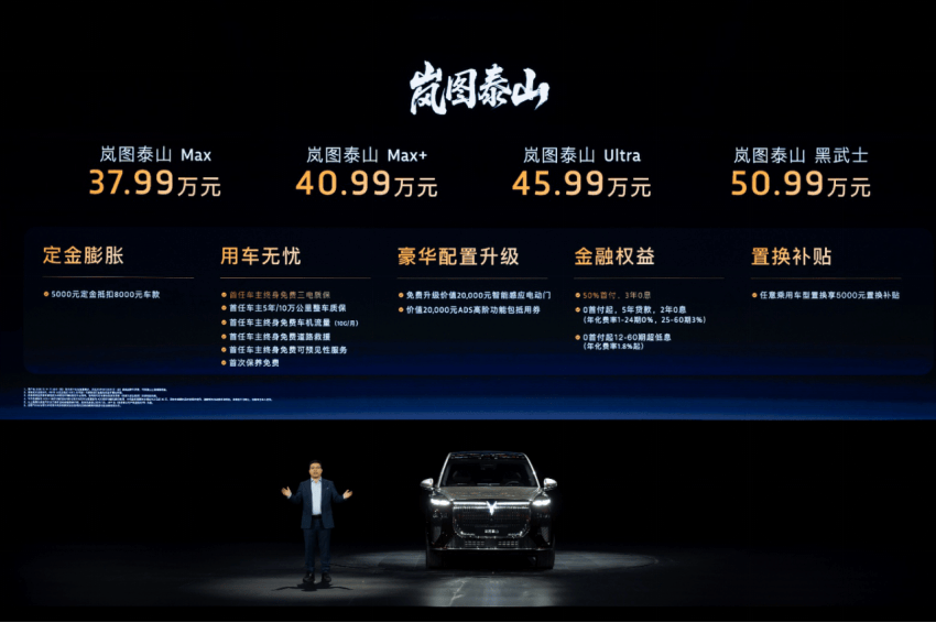 11月18日,嵐圖汽車在深圳國際會(huì)展中心正式推出旗下全新力作——嵐圖泰山。共推出Max版、Max+版、Ultra版、黑武士版四大版型,官方指導(dǎo)價(jià)為37.99萬元-50.99萬元。同時(shí),還公布了價(jià)值48000元的上市首銷期限時(shí)權(quán)益。