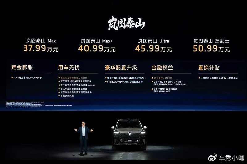11月18日,豪華大六座SUV嵐圖泰山正式上市,新車共推出4款配置車型,售價(jià)區(qū)間為37.99-50.99萬(wàn)元。值得注意的是,嵐圖泰山黑武士版將限量發(fā)售,明年一季度與大家見面。新車搭載最新版鴻蒙座艙語(yǔ)音大模型、華為ADS Ultra四激光雷達(dá)智能輔助駕駛方案、AI云舒座椅、32揚(yáng)聲器音響系統(tǒng)以及最新的三腔空氣懸架等配置,新車大有劍指問界M9(配置|詢價(jià))的意味。