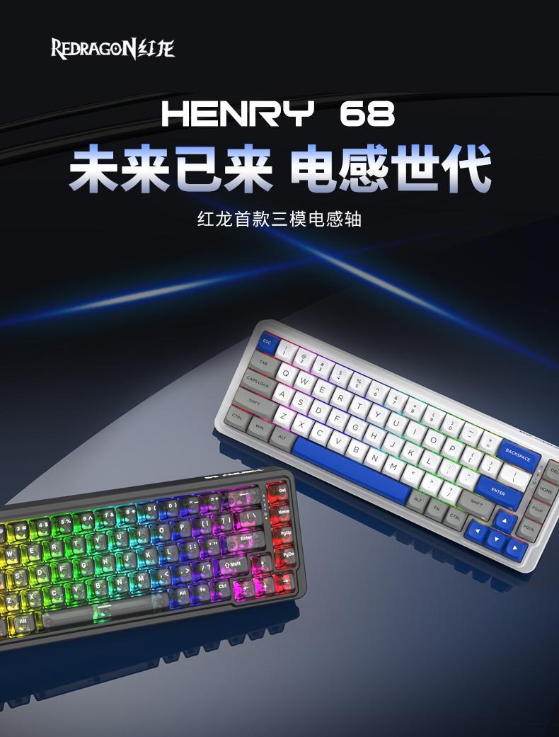 11 月 19 日消息,REDRAGON 紅龍上周上架了該品牌的首款三模電感軸鍵盤 HENRY 68。這一型號采用 68 鍵 65% 配列,搭載與優力緯爾合作開發的“特斯拉電感軸”。