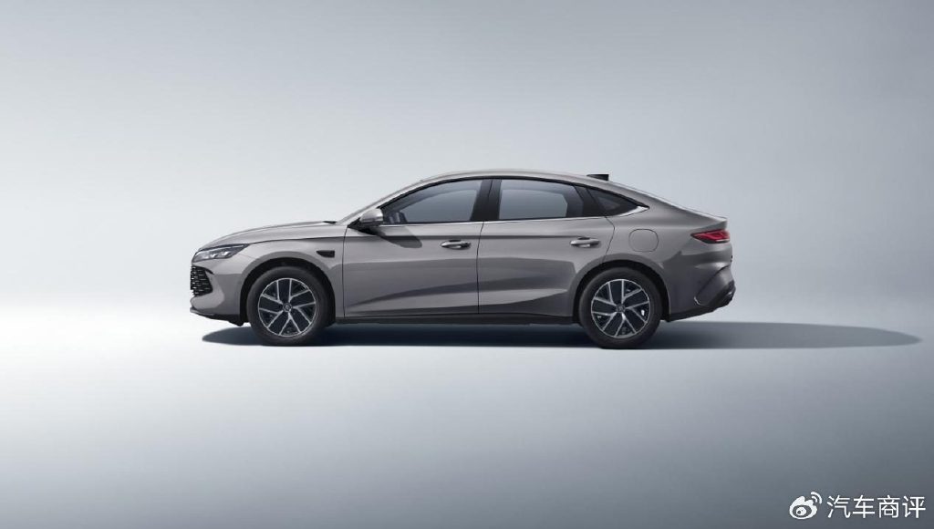從側面看,新車車身顯得修長優雅、輪廓流暢,高挑的肩線自前車蓋向后延伸,與一條自前翼子板下方向后延伸的腰線共同刻畫出豐富的視覺效果,搭配大溜背,進一步凸顯了整車的轎跑風味,而五幅式輪轂與整車低趴姿態的組合,也很好的融入了整車的運動氛圍感。