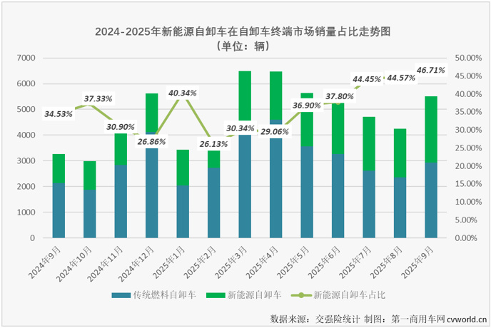 2025年9月份,國內重卡整體實銷8.34萬輛,同比增長92%。其中自卸車實銷5502輛,同比增長68%,9月份新能源自卸車在自卸車終端銷量的占比為46.71%,較上月占比(44.57%)提升2.14個百分點,自卸車市場新能源滲透率已連續3個月超過40%(如上圖);自去年6月份開始,自卸車市場新能源滲透率再也沒有低于過20%,今年1-9月,能源自卸車在自卸車終端銷量的占比為37.02%,比2024年全年占比(26.36%)高出10.66個百分點,比今年1-9月牽引車市場新能源占比高出4.24個百分點,比重卡市場整體新能源占比高出12.81個百分點,是重卡市場新能源占比最高的細分領域。