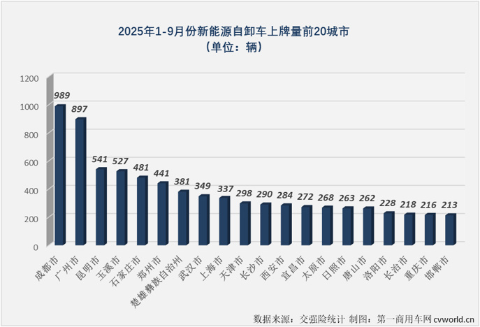 2025年1-9月,全國31個省級行政區都有新能源自卸車掛牌上路,區域分布仍呈現出不均衡的狀態,上牌量前7位的云南、四川、河北、廣東、河南、湖北和山西合計分走了近6成新能源自卸車終端銷量。具體到城市來看,2025年1-9月新能源自卸車上牌量靠前的城市有成都、廣州、昆明、玉溪、石家莊、鄭州、楚雄、武漢等市。