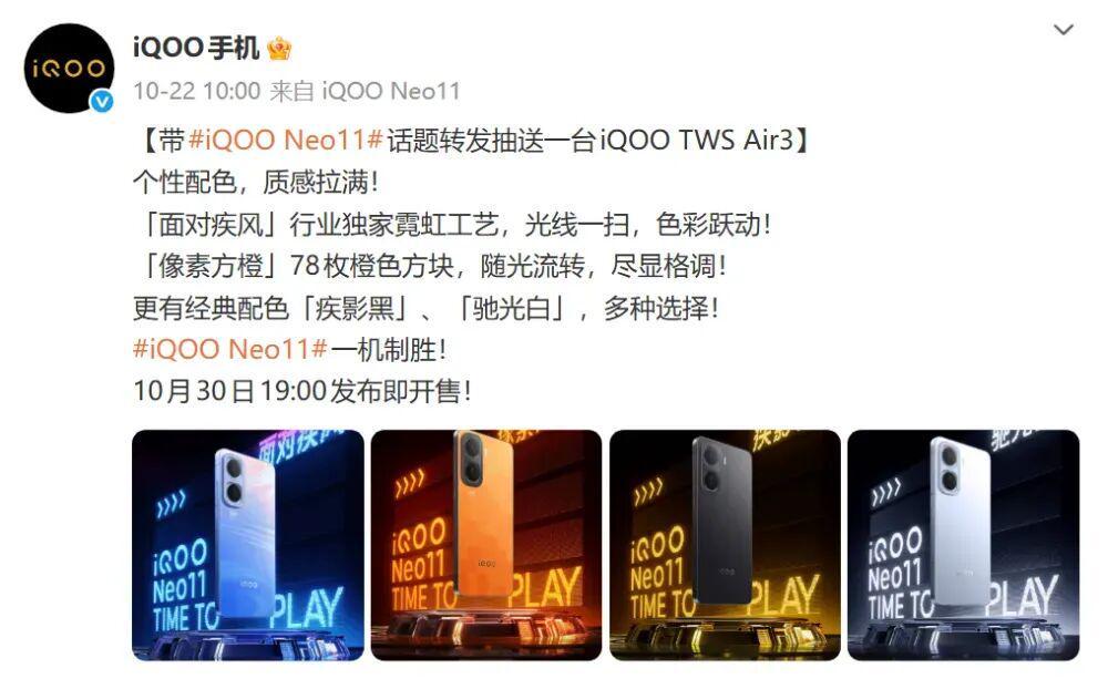 不久前,iQOO手機官方宣布,iQOO Neo11將于10月30日19:00發布即開售。